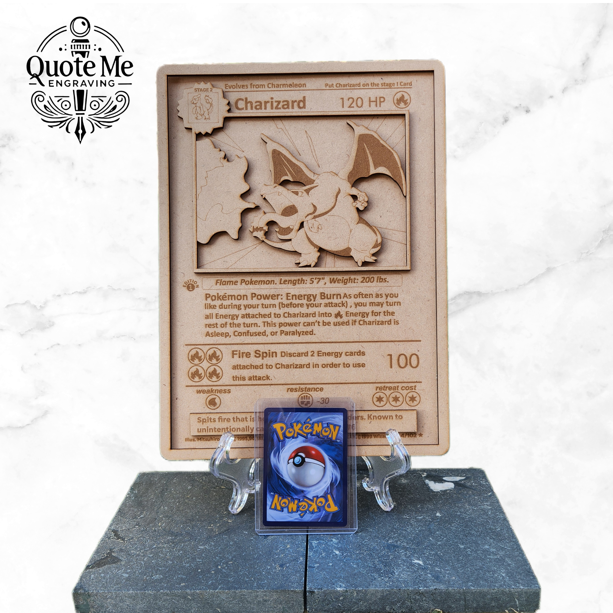 100th customer to purchase from Quote Me Engraving wins this super large 3 layered hand made Charizard vauled at $60 Stall number E08 *Pokemon card there for size reference *Purchases also includes deposit on orders